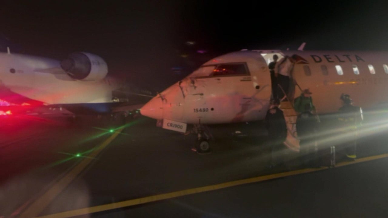 Two regional jets crashed into each other on the tarmac at New York’s LaGuardia Airport when the wing of one aircraft hit the front end of another. One flight attendant was injured.