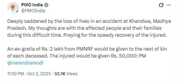 हादसे के बाद प्रधानमंत्री नरेंद्र मोदी ने शोक प्रकट कर पीड़ितों के परिजनों और घायलों के इलाज के लिए आर्थिक सहयोग का एलान किया। प्रधानमंत्री कार्यालय से रात 11 बजे के बाद जारी बयान में कहा गया, ‘पीएम मोदी मध्य प्रदेश के खंडवा में हुए एक हादसे में हुई जान-माल की हानि से अत्यंत दुःखी हैं। इस कठिन समय में उनकी संवेदनाएं प्रभावित लोगों और उनके परिवारों के साथ हैं।’ उन्होंने घायलों के शीघ्र स्वस्थ होने की कामना करते हुए प्रधानमंत्री राष्ट्रीय राहत कोष से प्रत्येक मृतक के परिजनों को 2-2 लाख रुपये की अनुग्रह राशि देने का एलान किया। प्रधानमंत्री ने कहा कि घायलों को 50,000 रुपये दिए जाएंगे।