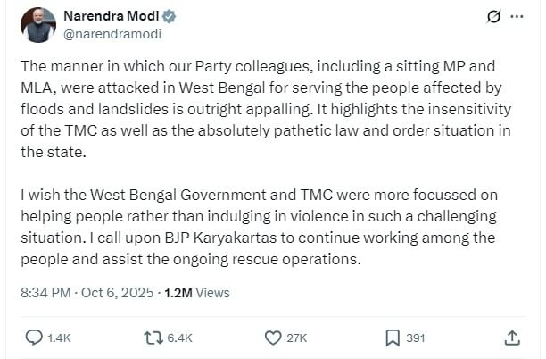 प्रधानमंत्री ने तृणमूल कांग्रेस को असंवेदनशील बताते हुए अपने एक्स हैंडल पर लिखा, काश पश्चिम बंगाल सरकार और टीएमसी हिंसा फैलाने के बजाय लोगों की मदद में जुटी होती। मैं भाजपा कार्यकर्ताओं से अपील करता हूं कि वे जनता के बीच काम जारी रखें और राहत कार्यों में सहयोग दें।