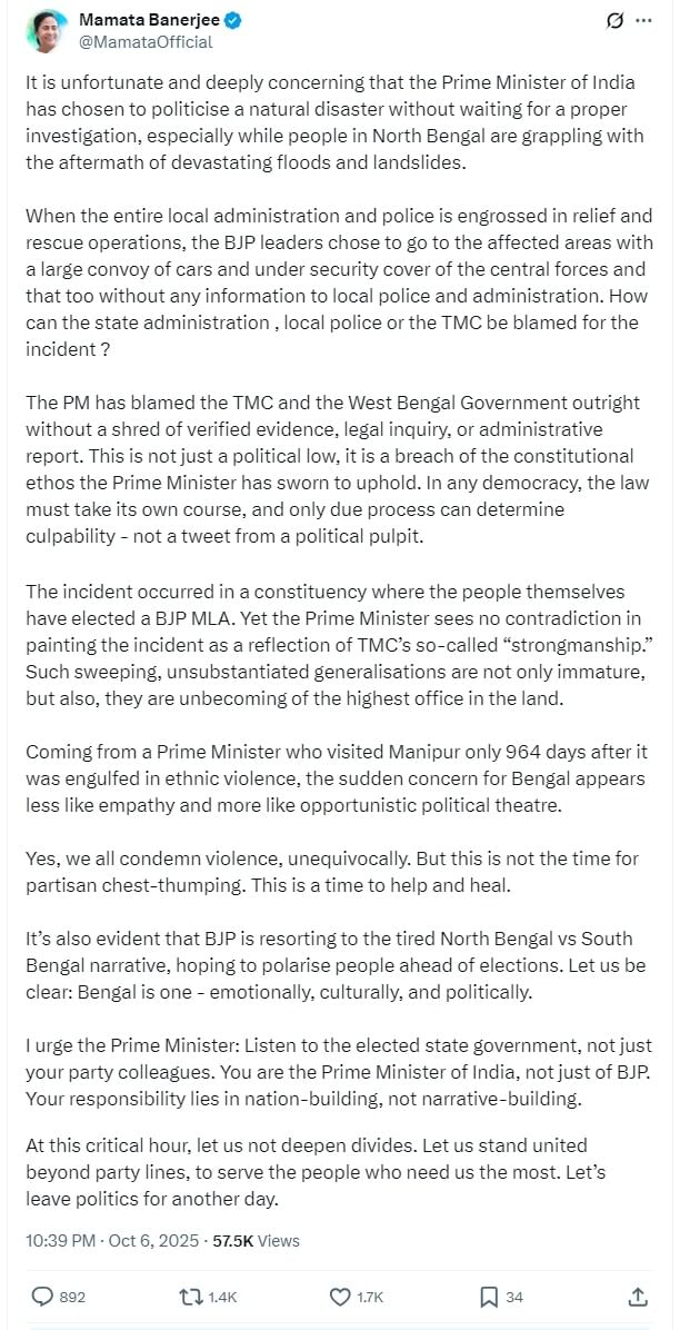 पीएम मोदी के एक्स पोस्ट आने के लगभग दो घंटे बाद 386 शब्दों के विस्तृत एक्स पोस्ट में ममता बनर्जी ने अपने आक्रामक तेवर दिखाए। उन्होंने कहा कि राज्य सरकार और मौसम की मार झेल रहे इलाकों में स्थानीय प्रशासन के साथ मिलकर राहत और बचाव कार्य की योजना पर काम कर रही है, तो दूसरी तरफ भारत के प्रधानमंत्री ने बिना किसी सत्यापित सबूत, कानूनी जांच या प्रशासनिक रिपोर्ट के टीएमसी, पश्चिम बंगाल सरकार को दोषी ठहरा दिया। यह केवल राजनीतिक नीचता ही नहीं बल्कि सांविधानिक मूल्यों का उल्लंघन भी है।