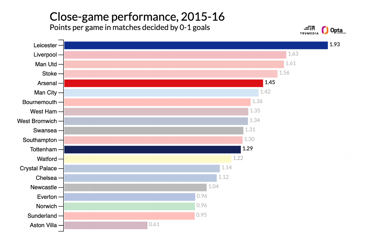 It wasn’t that Leicester were abnormally good in tight games — it’s that the other contenders were abnormally bad. Arsenal led the league with a plus-19 goal differential after 40 minutes but were only plus-10 for the last 50 minutes and won only 20 of 27 games in which they led. Spurs won only 19 of 28 such games and averaged a dreadful 1.29 points per close game.